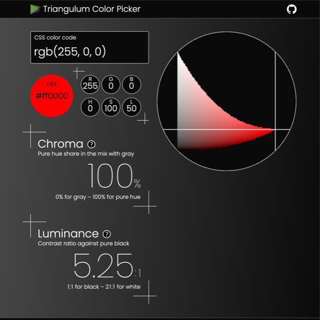This web tool visualizes the level of luminance and the share of pure hue for the CSS color code entered by the user.